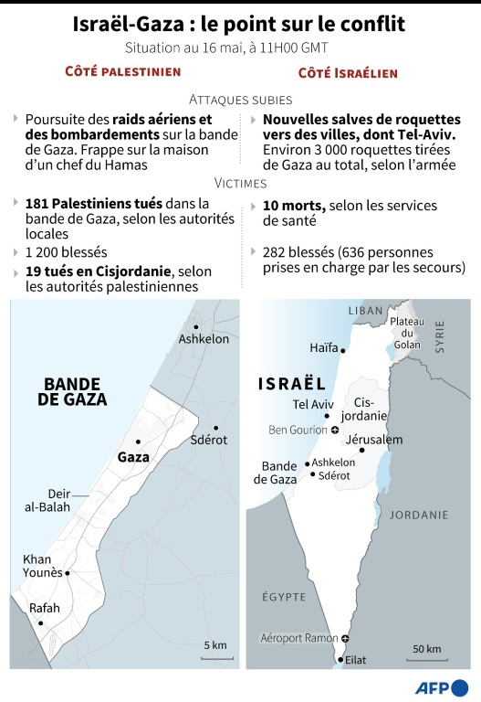 Côté israélien, 10 personnes ont été tuées dont un enfant, et 282 blessées après des tirs de groupes armés palestiniens depuis Gaza, dont le Hamas au pouvoir. Ceux-ci ont tiré plus de 3.100 roquettes vers Israël depuis le début des hostilités, le rythme le plus élevé de projectiles jamais tirés sur le sol israélien, a indiqué dimanche l'armée israélienne, soulignant qu'une grande partie avait été interceptée par son système anti-missile.