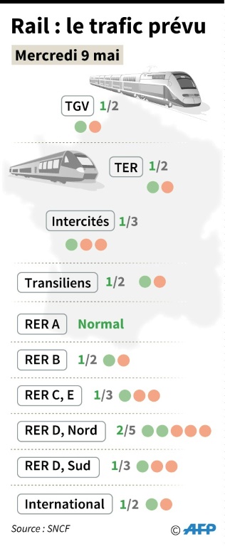 Il y aura un train Intercités sur trois, a ajouté la direction dans un communiqué. En Ile-de-France, le trafic sera normal sur le RER A, tandis qu'on comptera un train sur deux pour le RER B et un train sur trois pour le RER C. À l'international, il y aura en moyenne un train sur deux, avec un trafic "quasi normal" pour les Eurostar et Thalys.
