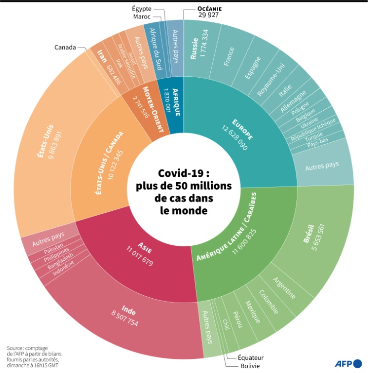 Alors que plus de 50 millions de cas de coronavirus ont été détectés dans le monde, le président élu des Etats-Unis Joe Biden met en place dès lundi une cellule de crise pour tenter de juguler la pandémie dans son pays, de loin le plus affecté de la planète.