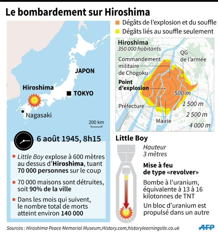 Le ciel était clair comme le 6 août 1945 quand, à 08h15 heure locale, un bombardier B-29 américain baptisé "Enola Gay" largua sur la ville la bombe atomique "Little Boy", provoquant le jour même et dans les semaines suivantes le décès de 140.000 personnes.