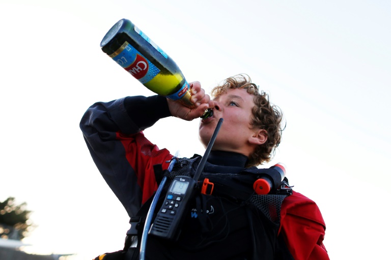 A son arrivée, Tom a brandi des feux de détresse et fait résonner sa corne de brume pour saluer ses supporters, à la manière des skippers professionnels. Les yeux pétillants, il a ensuite bu quelques gorgées de Champomy au goulot, tandis que ses admirateurs le photographiaient avec leur smartphone.