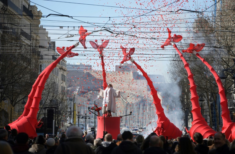 De grandes girafes rouges en papier, clin d??il à leur ancêtre au long cou offerte à Charles X par le vice-roi d?Égypte et débarqué à Marseille en 1826, y ont déambulé en fanfare le 29 janvier pour le lancement des "Dimanches de la Canebière".