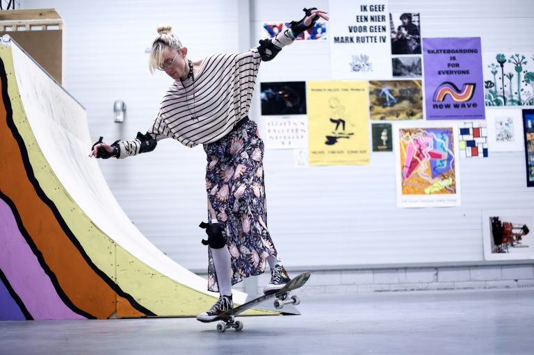 "Le skateboard est pour tout le monde", lit-on sur une banderole accrochée au mur tandis qu'un logo arc-en-ciel est peint au-dessus de rampes en bois construites dans un entrepôt du sud de la capitale néerlandaise.