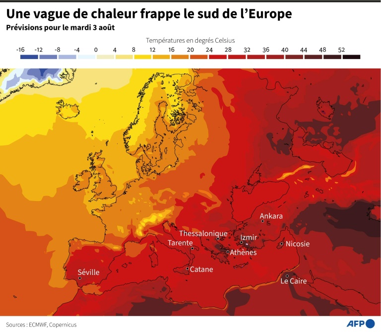 Depuis jeudi, la Grèce traverse une période caniculaire qui devrait atteindre un pic lundi et mardi et durer jusqu'à jeudi. "Nous faisons face à la pire canicule depuis 1987", a prévenu le Premier ministre Kyriakos Mitsotakis, en exhortant les Grecs à "limiter leur consommation électrique" pour éviter une panne générale. En juillet 1987, une vague de chaleur avait fait plus d'un millier de morts, en raison du manque de climatisation et de la pollution atmosphérique.