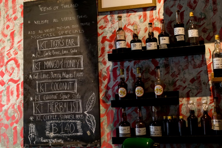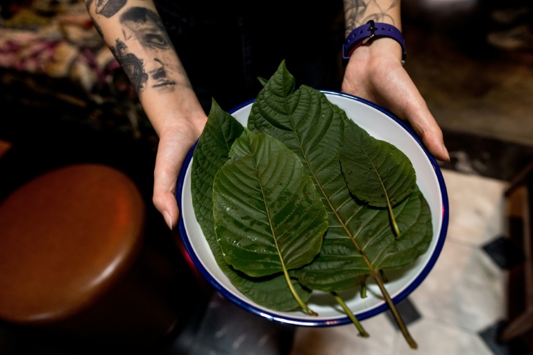 Un client boit une concoction de mangue et de citron vert surmontée d'une mousse au miel, servie dans une tasse en cire d'abeille, le léger goût amer des feuilles de kratom étant équilibré par la douceur fruitée. Au bout du bar, Pord, 40 ans, essaie son premier "Tiger Ear", boisson à base de kratom, d'eau gazeuse et de citron vert. "Ça a le goût d'une prune acidulée. C'est rafraîchissant", dit-il à l'AFP.