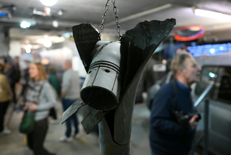 Une vingtaine d'épaves de drones russes, ceux-là même qui s'abattent sur les soldats comme les civils, sont suspendus au plafond, au dessus d'une voiture éventrée par une bombe, acheminée dans le sous-sol du bunker depuis Kherson, ville du sud de l'Ukraine reconquise par Kiev en novembre 2022 mais qui reste, avec ses habitants, sous le feu russe.