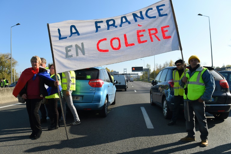 "Je suis là pour soutenir le mouvement. Il y en a marre, on taxe toujours les mêmes, ils n'ont qu'à taxer les riches", dit la sexagénaire qui ne veut pas "cabosser sa voiture" en l'utilisant pour manifester, "c'est pas avec les aides de Macron que j'aurai les moyens de m'en payer une autre".