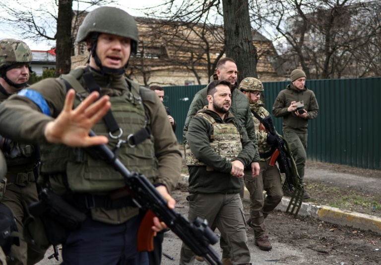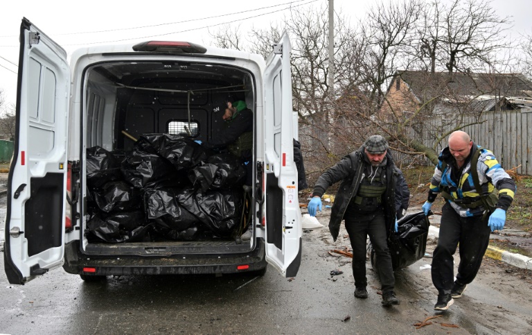 Samedi, l'AFP a vu a Boutcha les cadavres d'au moins 22 personnes portant des vêtements civils dans des rues de la ville. L'une d'elles était couchée près d'un vélo et une autre avait des sacs à provisions à côté d'elle. Un cadavre avait les mains liées dans le dos.