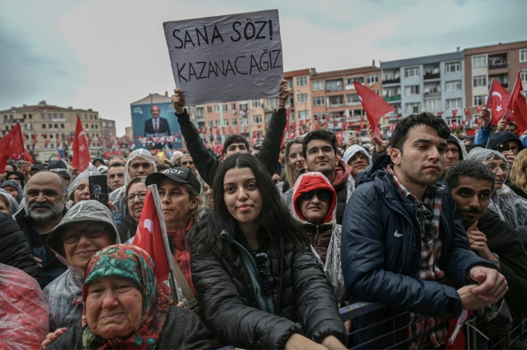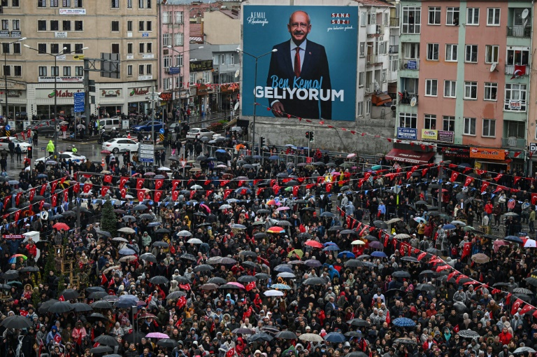 Une mer de parapluie et de capuches à ses pieds, Kemal Kilicdaroglu, le candidat de l'opposition turque qui défiera Recep Tayyip Erdogan le 14 mai dans les urnes, promet en souriant "le retour du printemps".