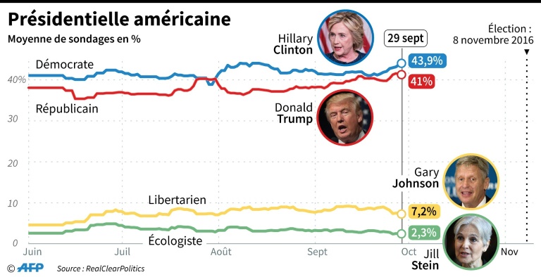 Au niveau national, Hillary Clinton (68 ans) était créditée lundi de 43,8% des intentions de vote contre 41% pour Donald Trump et 7,2% pour le candidat libertarien Gary Johnson, selon la moyenne des derniers sondages calculée par Real Clear Politics.