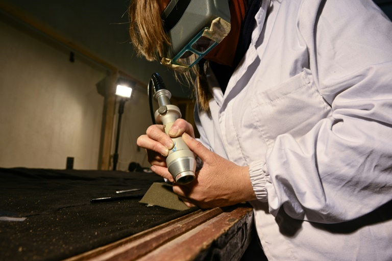 Avec sa blouse et ses épaisses lunettes de protection, elle progresse, millimètre par millimètre, pour enlever les couches de peinture successives ajoutées sur le cadre au fil du temps et retrouver les couleurs d'origine.