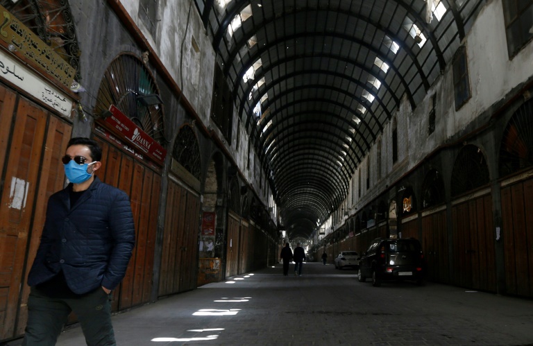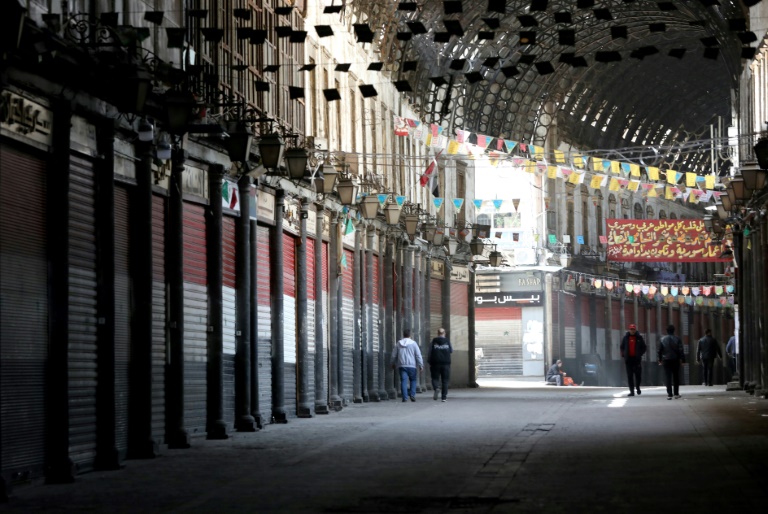Rideaux de fer baissés, stands couverts par des draps, les rues commerçantes du vieux Damas comme ailleurs dans la capitale syrienne sont presque vides. Dans le célèbre souk al-Hamidiyé, d'habitude grouillant de monde, seuls des ouvriers en combinaisons oranges et masques de protection pulvérisent du désinfectant sur les rideaux de fer fermés par des cadenas tandis que quelques passants portant des masques traversent rapidement la rue.