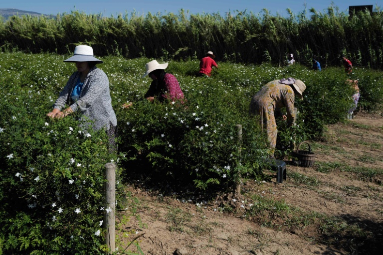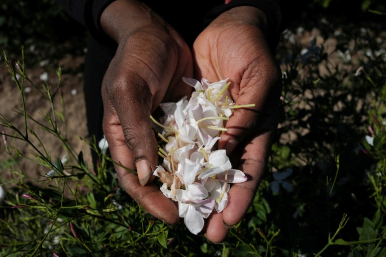 Cultivée désormais sur moins d'une douzaine d'exploitations autour de cette ville, berceau historique de la parfumerie, la petite fleur blanche --Jasminum Grandiflorum pour les botanistes-- éclot la nuit et se ramasse le matin. Un labeur éprouvant effectué à 90% par des femmes, courbées ou accroupies sous le soleil entre les rangées d'arbustes, exclusivement à la main et d'un geste répété des milliers et des milliers de fois puisqu'il faut 8.000 à 10.000 fleurs pour faire un kilo à la pesée en fin de matinée.