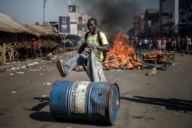 Des militants érigent en ville des barricades avec des briques, des blocs de béton, des pierres, des kiosques à journaux, et mettent le feu à des papiers et des morceaux de bois en chantant "Chamisa". D'autres arrachent des panneaux de signalisation.