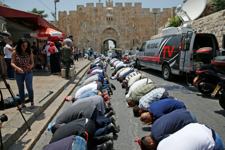 L'esplanade, troisième lieu saint de l'islam qui abrite la mosquée Al-Aqsa et le Dôme du Rocher, était pratiquement vide lundi. Seuls quelques touristes et visiteurs juifs s'y sont rendus, selon une journaliste de l'AFP sur place. Comme dimanche, des centaines de musulmans ont prié à l'extérieur de deux des entrées du site pour protester contre l'installation des détecteurs de métaux.