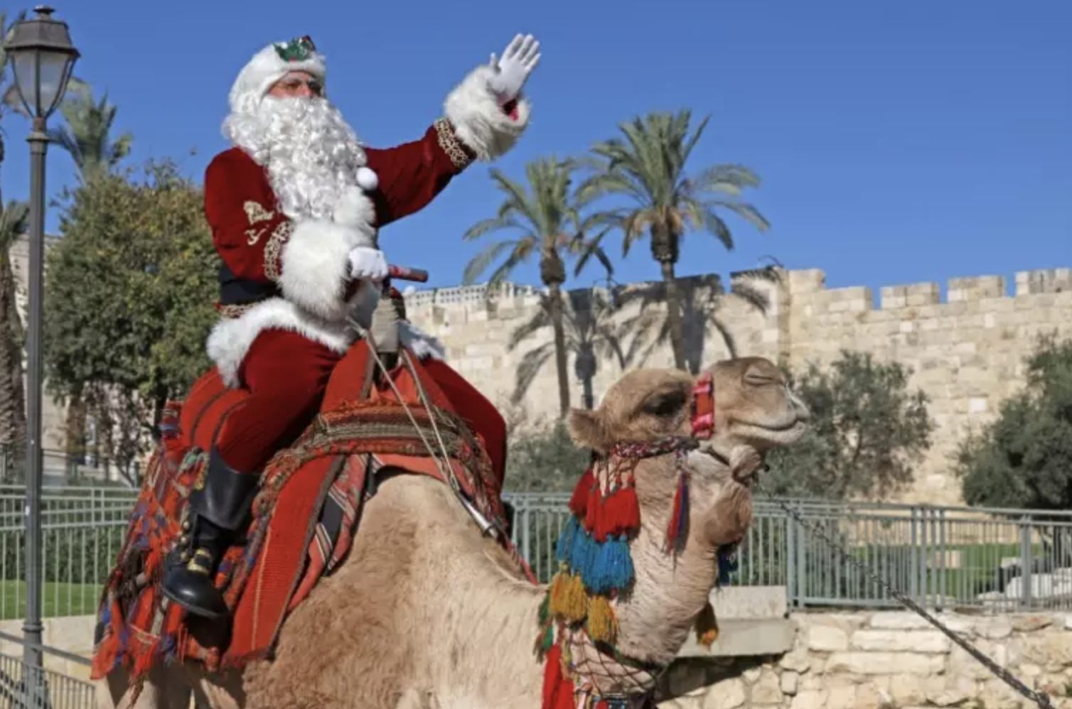 Sur place, les gamins demandent-ils la paix dans le monde pour Noël? "Ils me demandent plutôt un iPhone", répond l'intéressé. "Je ne promets rien et leur dis: +prions et si tu es sur ma liste tu recevras quelque chose+", ajoute ce père Noël qui lance la saison des fêtes en entrant dans la Vieille Ville à dos de chameau, à défaut de rennes.