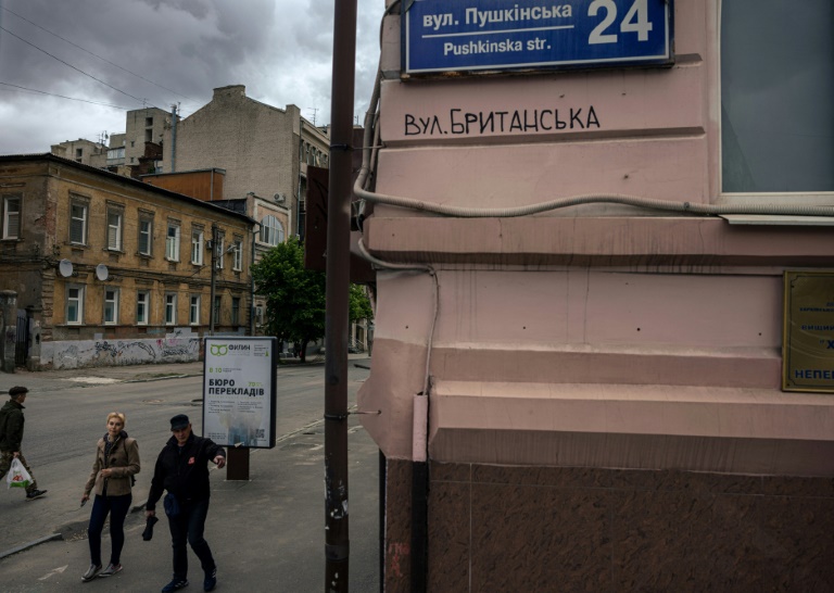 Rue de Moscou, des habitants avaient précédé la mairie, et apposé un faux panneau "avenue Grigori Skovoroda", du nom du philosophe ukrainien du 18e siècle, en lieu et place d'un des anciens panneaux, dont la plupart sont encore visibles. L'application de géolocalisation Google Maps a en revanche déjà changé le nom de la rue à celui des "Héros de Kharkiv".