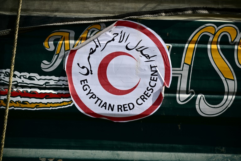 Matelas, couvertures et denrées alimentaires débordent des remorques des camions siglés du symbole du Croissant-Rouge égyptien. Un chien renifleur, accompagné de soldats lourdement armés, inspecte aléatoirement les marchandises.