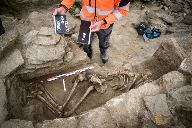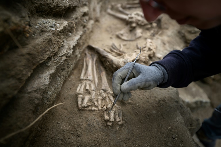 Accroupi, à l'aide d'un fin crochet de dentiste, Yannick Prouin dégage progressivement les ossements avant de les placer dans des sachets transparents. L'archéo-anthropologue les étudiera et les datera en laboratoire une fois les fouilles finies.