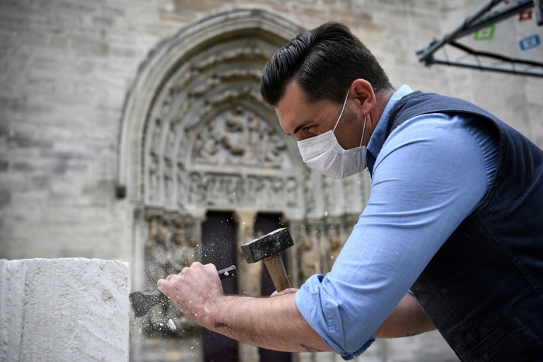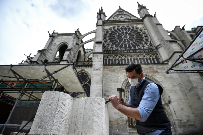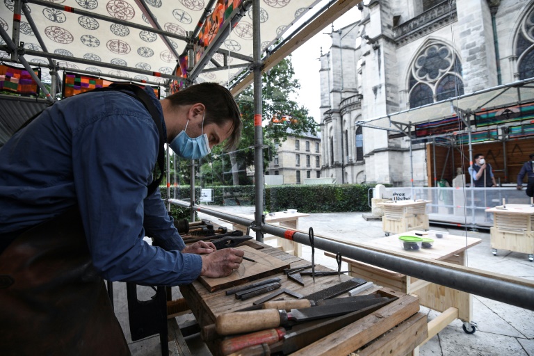 Depuis vendedi, le son des outils sur la pierre résonne dans l'espace dédié aux démonstrations, à quelques mètres de l'édifice, célèbre pour abriter la nécropole des rois de France.