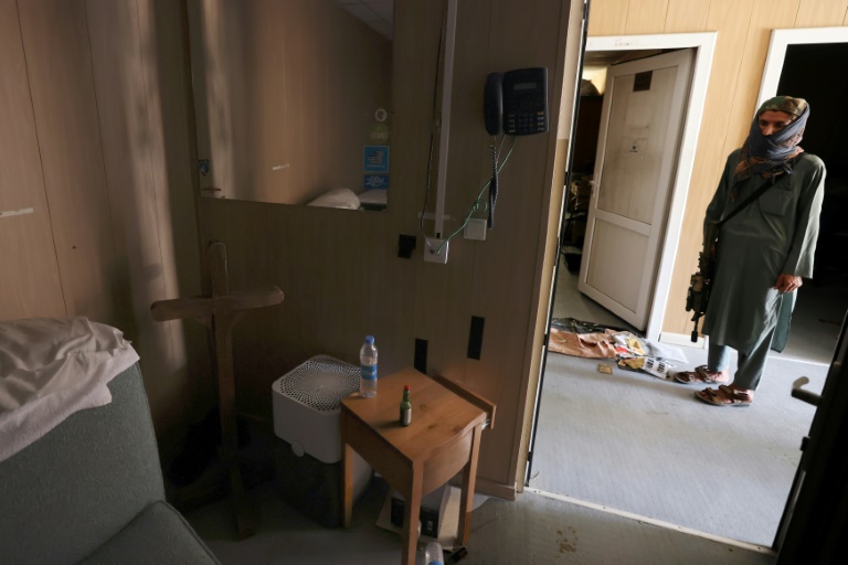 Dans une baraque voisine, où flotte une odeur de nourriture en putréfaction, un combattant taliban armé d'un fusil d'assaut M16 prend des photos avec son téléphone portable, en souvenir. Un mois après la reconquête de la capitale afghane par le mouvement islamiste, ces lieux offrent à voir les derniers vestiges de vingt ans de présence américaine, ponctuée par un départ précipité.