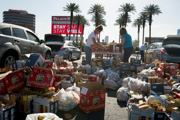 Chacun se voit remettre un carton contenant du fromage, des pommes, du poulet, des pommes de terre et du thé glacé, déposé directement dans le coffre de la voiture. Le site du Palace Station est l'un des vingt points de distribution mis en place à Las Vegas par l'ONG Three Square, qui s'approvisionne aussi bien auprès des programmes d'aide du gouvernement fédéral que de donateurs et commerçants locaux.