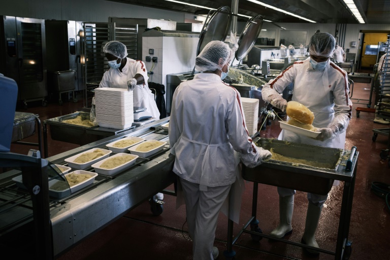 Ce jour de juin, quand l'AFP s'y rend, c'est poisson-purĂ©e. PrĂšs de six tonnes de pommes de terre, produites Ă trois kilomĂštres de lĂ , ont Ă©tĂ© livrĂ©es pour ĂȘtre mĂ©caniquement Ă©pluchĂ©es, dĂ©sinfectĂ©es, rincĂ©es ; avant d'ĂȘtre cuites, Ă©crasĂ©es puis mĂ©langĂ©es Ă du lait dans des marmites de 250 kilos.