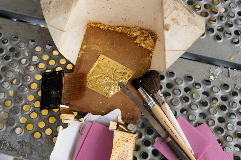 "Une fois qu'on a terminé l'époussetage, on vient passer un matage", explique la doreuse, "de l'eau avec un peu de gélatine alimentaire" permettant de lisser le peu de feuilles d'or qui restent.