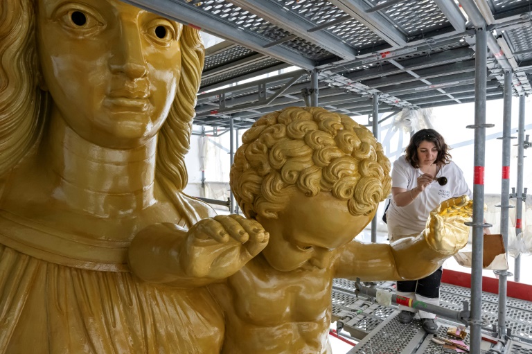 Décoiffée de sa couronne en août, la statue de la vierge à l'enfant protectrice de la cité phocéenne est depuis mercredi recouverte de 30.000 à 40.000 feuilles d'or, afin de lui redonner l'éclat qu'elle avait perdu à cause du mistral, de l'air marin et de la pollution industrielle.