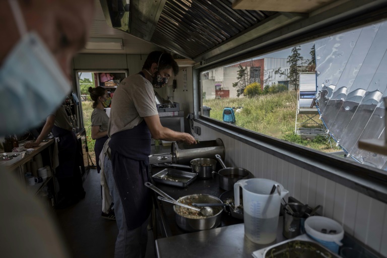 Julienne de légumes verts, risotto aux asperges...: les recettes changent régulièrement, mais sont composées de "produits locaux cuisinés au soleil", abonde Pierre-André Aubert. "Même les aromates viennent d'ici", promet-il, en montrant les herbes folles entourant les tables disposées sur un terrain de Château-Gombert, un quartier du nord de Marseille.