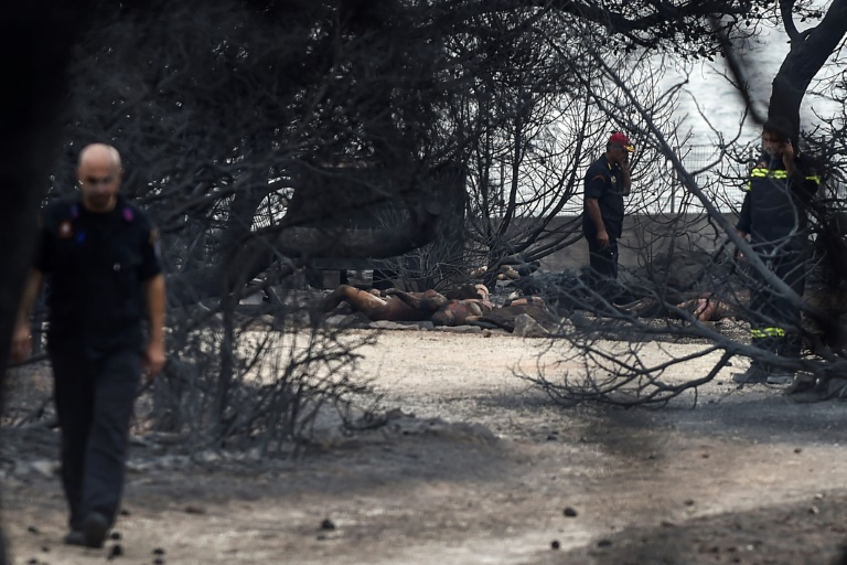 Leurs corps calcinés gisaient "par groupes de quatre ou cinq personnes, peut-être des familles, des amis ou des inconnus qui s'étaient enlacés dans une dernière tentative de se protéger, alors qu'ils tentaient de gagner la mer, à 30 ou 40 mètres de là", témoigne Vassilis Andriopoulos, un des sauveteurs de la Croix-Rouge qui a découvert l'horrible spectacle mardi matin. Il déplore la présence de "petits enfants" dans ce groupe. Fuyant les flammes, ils ont semble-t-il été piégés entre le feu et la falaise qui dégringole vers la mer sur une trentaine de mètres.