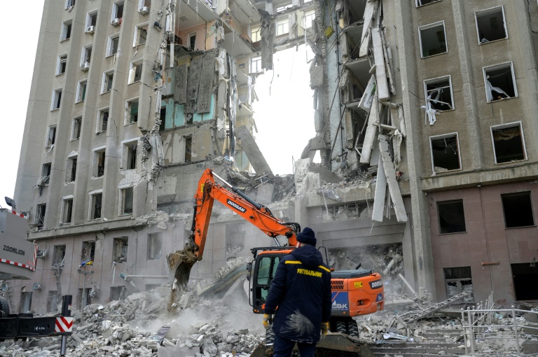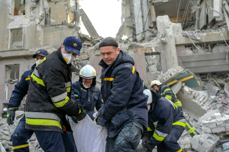 Dans le chaos de gravats au pied de l'édifice, les sauveteurs tentent d'extraire les victimes et d'improbables survivants. Au moins sept personnes ont été tuées et 22 autres blessées, a annoncé le président ukrainien Volodymyr Zelensky. Des journalistes de l'AFP ont vu deux corps évacués, ceux d'un homme en uniforme et d'une femme âgée.