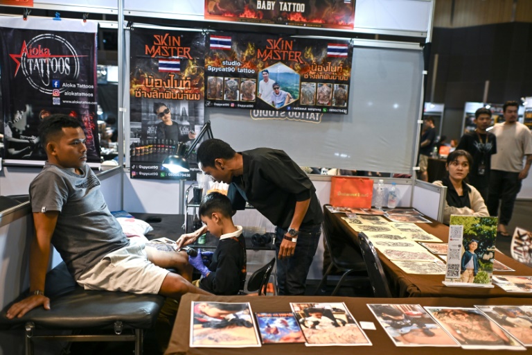 A neuf ans, Napat Mitmakorn manie avec habileté le pistolet à tatouer de ses mains d'enfants gantées pour esquisser le motif d'un long serpent devant des visiteurs interloqués d'un salon du tatouage à Bangkok.