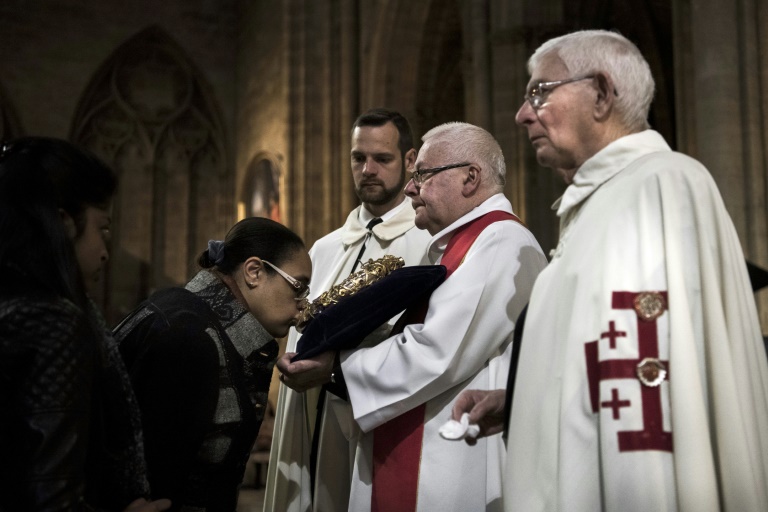 Ils déposent "de lourds fardeaux", leurs intentions de prière: en ce Vendredi saint, à deux jours de Pâques, un flux continu de fidèles vient vénérer à Notre-Dame de Paris la "sainte couronne d'épines", considérée comme une relique de la Passion du Christ.