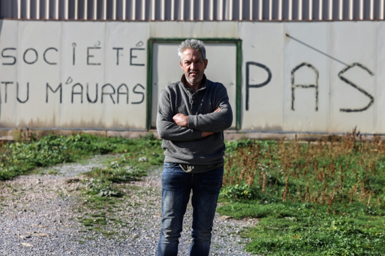 Derrière lui, une immense inscription "Société tu m'auras pas" est peinte sur le mur de son bâtiment agricole, allusion à une chanson de Renaud et à Société des caves, filiale de Lactalis, principal industriel de la filière.