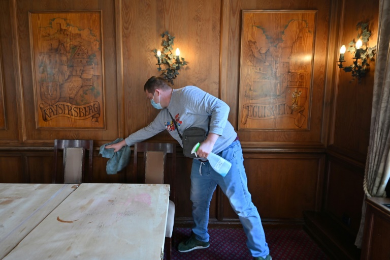 Masque sur le visage, chiffon et bidon de produit désinfectant dans les mains, Vincent Leclopé s'affaire sur des boiseries : "j'enlève d'abord toutes les poussières" accumulées pendant les longues semaines de fermeture, une première étape avant d'autres désinfections, explique le maître d'hôtel. En effet, passer une seule fois du produit ne suffit pas : "les poussières risqueraient de coller au bois et ça ne serait pas propre", poursuit-il.