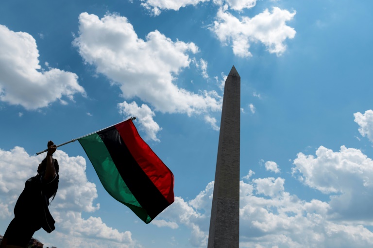 Katima McMillan, 24 ans, est venue du Kentucky avec un groupe de militants. Sur la pelouse, ils ont déployé les bandes des trois couleurs du panafricanisme, rouge pour le sang versé, noir pour le peuple et la culture du continent, et vert pour la nature.