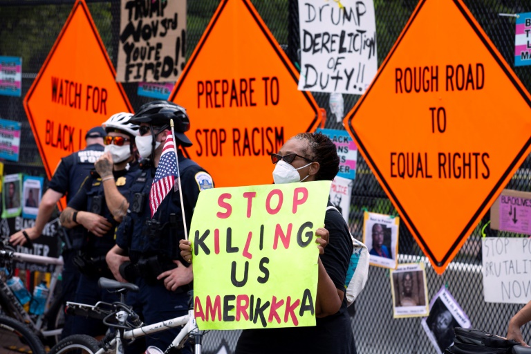 Aux cris de "Les vies noires comptent", les manifestants antiracistes remontent l'avenue longeant la Maison Blanche et abreuvent d'insultes une militante arborant une pancarte de soutien à Donald Trump.