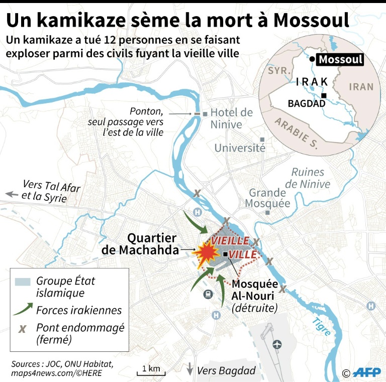 L'homme a tué douze personnes en faisant détonner sa bombe parmi des familles fuyant la vieille ville de Mossoul, le dernier fief urbain en Irak des jihadistes de l'EI. Ce carnage est survenu après la destruction mercredi soir par l'EI de la mosquée Al-Nouri --où Abou Bakr al-Baghdadi avait donné en juillet 2014 son premier prêche en tant que leader de l'EI- et son célèbre minaret penché, dans le Vieux Mossoul. Médecin au sein de l'armée irakienne, Ahmed Hachem a dit avoir reçu dans un hôpital de campagne 12 morts et plus de 20 blessés, "y compris des femmes et des enfants".