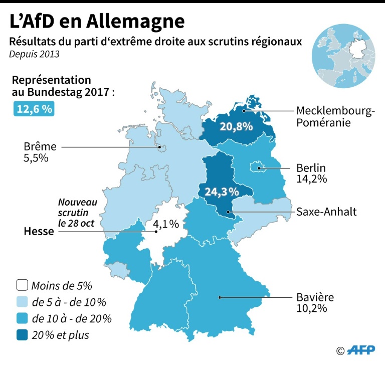 Ils rêvent même de conquérir dimanche une seconde région, après le Bade-Wurtemberg qu'ils dirigent depuis 2011 en se montrant extrêmement pragmatiques. Avec un score attendu autour de 13%, le parti d'extrême droite Alternative pour l'Allemagne (AfD), né il y a cinq ans seulement, devrait achever son implantation régionale en étant désormais représenté dans les parlements des 16 Länder.