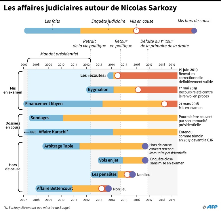 Nicolas Sarkozy, qui a exclu récemment tout retour au sein des Républicains, plombés par leur déroute aux européennes, vit sa retraite politique sous pression judiciaire: à côté des dossiers Azibert et Bygmalion, il a été mis en examen en mars 2018, notamment pour corruption passive, dans l'affaire libyenne.