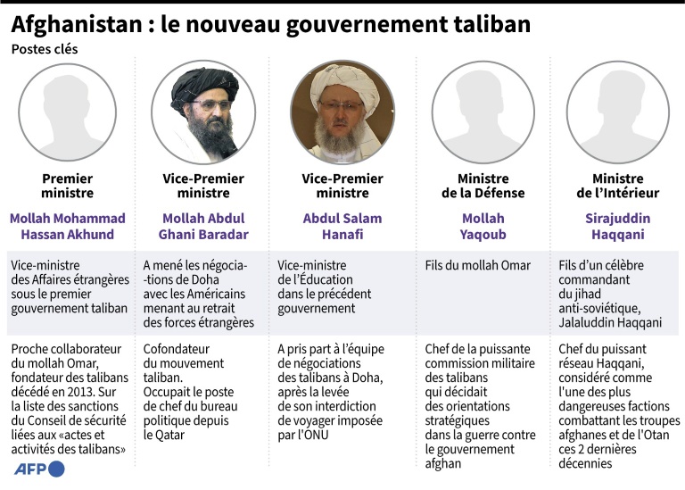 Le ministère de la Défense a été confié au mollah Yaqoub, fils du mollah Omar, fondateur du mouvement des talibans. Le gouvernement est dirigé par Mohammad Hassan Akhund, ex-ministre entre 1996 et 2001, assisté notamment d'Abdul Ghani Baradar, co-fondateur des talibans. Il doit maintenant s'atteler à consolider le pouvoir des fondamentalistes, revenus soudainement au pouvoir à la mi-août à la faveur du retrait américain, d'une offensive éclair et de l'effondrement du gouvernement pro-occidental.