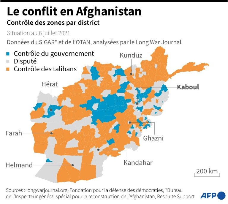Les forces américaines et de l'Otan avaient évacué la semaine passée la base aérienne de Bagram, plus importante installation militaire de la coalition en Afghanistan et centre névralgique de ses opérations sur place depuis l'entrée des troupes américaines dans le pays dans la foulée des attentats du 11-Septembre. Le retrait définitif de l'armée américaine sera terminé d'ici la fin août, selon la Maison Blanche. Il mettra un point final à 20 ans d'intervention américaine dans le pays, la plus longue guerre menée par les États-Unis dans leur histoire.