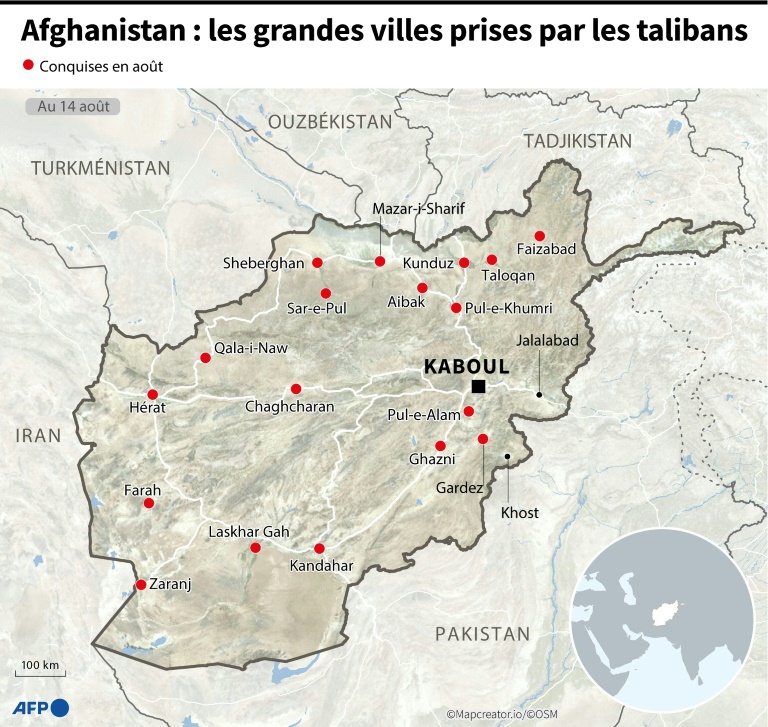 En à peine dix jours, les talibans, qui avaient lancé leur offensive en mai à la faveur du début du retrait final des troupes américaines et étrangÚres, ont pris le contrÎle de la grande majorité du pays et sont arrivés aux portes de Kaboul, désormais complÚtement encerclée.