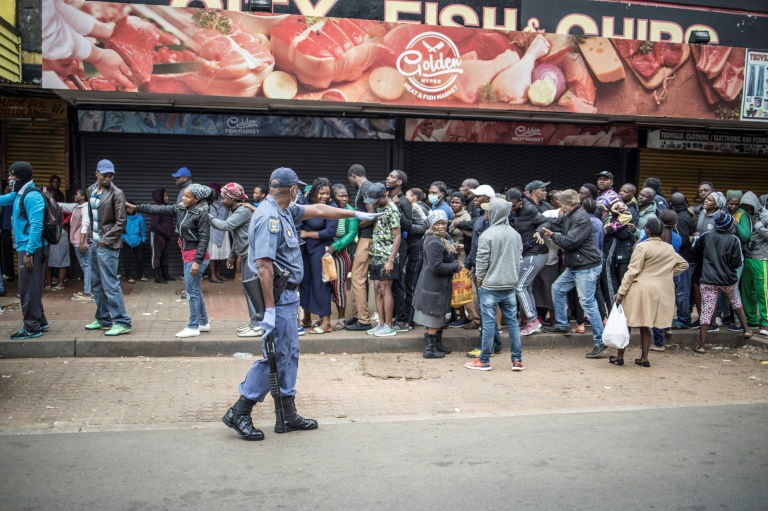 Les clients - 200 à 300 y compris des femmes et des enfants - faisaient la queue depuis le matin devant un supermarché d'alimentation du quartier déshérité de Yeoville, en plein centre de la plus grande ville du pays, sans respecter les consignes de distance, a constaté un photographe de l'AFP.Arrivés à bord de plusieurs véhicules, des policiers sont intervenus en ouvrant le feu avec des balles en caoutchouc pour disperser la foule, avant de reformer la file en faisant respecter les distances à coups de fouet.