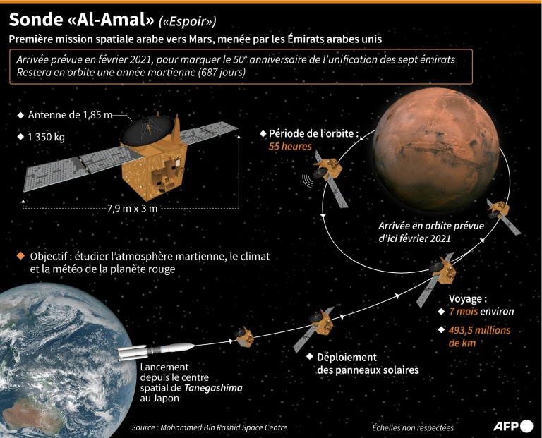 La sonde émiratie "Al-Amal" (Espoir), première mission interplanétaire arabe, a été lancée lundi avec succès depuis le Japon, en route pour l'orbite de Mars dont elle devra fournir des images pour mieux comprendre son atmosphère et son climat.