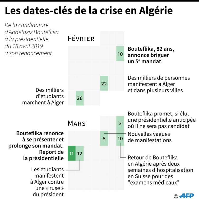 Au lendemain d'une marche de plusieurs milliers d'étudiants, plus d'un millier d'enseignants et d'élèves ont manifesté ensemble contre l'extension sine die du 4e mandat du président, et plus largement afin de réclamer "une meilleur avenir" pour la jeunesse. "Les temps ont changé, nous sommes le pouvoir, vous êtes le désespoir. Dégagez!", pouvait-on lire sur une des pancartes brandies. Les enseignants, mobilisés à travers le pays, ont commencé à manifester dans le centre d'Alger avant d'être progressivement rejoints par de nombreux élèves, privés de cours, a expliqué un enseignant à l'AFP.