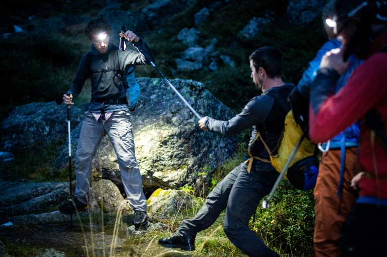 A peine ralenti par le sol glissant et instable, David Labarre se fie dans la pénombre à la lumiÚre accrochée devant lui sur le sac de son binÎme, Morgan Périssé, qui en vient parfois à oublier son handicap.