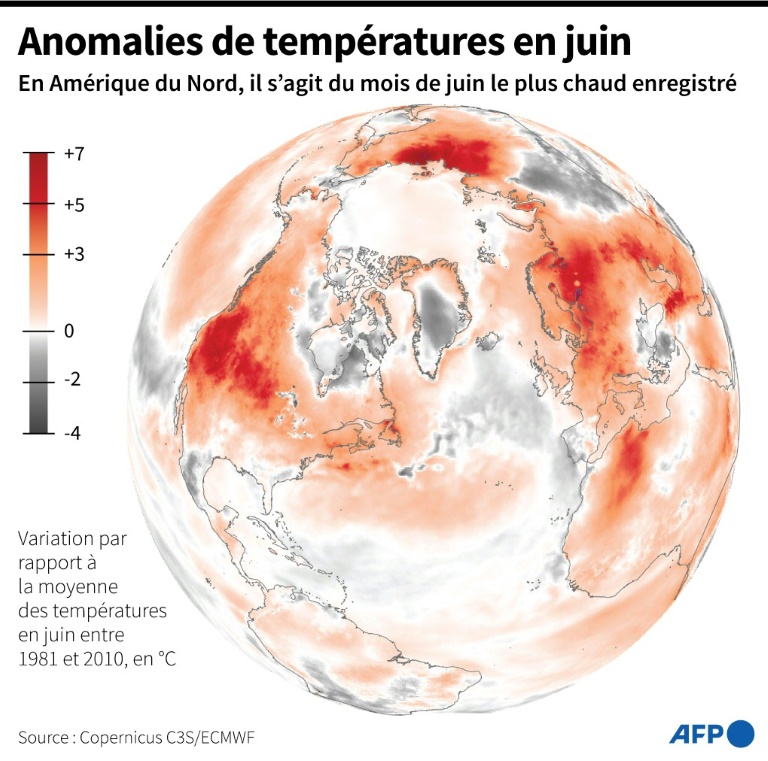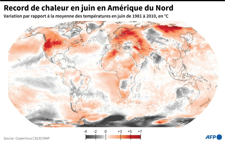Juin 2021 a dépassé de 1,2°C la moyenne de la période 1991-2020, soit 0,15°C au-dessus du précédent mois de juin le plus chaud pour cette région, en 2012, a précisé à l'AFP Carlo Buontempo, directeur du C3S, liant ce record à la canicule observée au Canada et sur une partie des Etats-Unis.