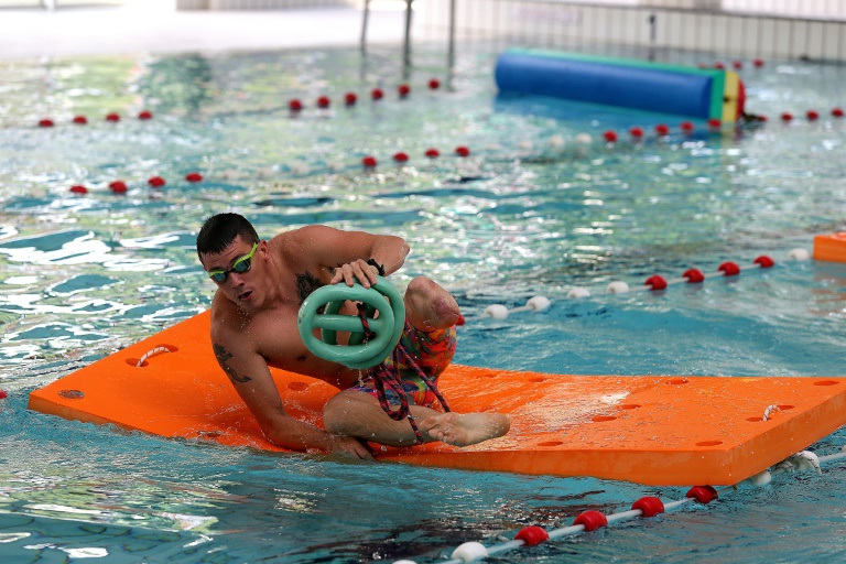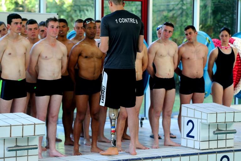 Avec des gestes assurés, le caporal-chef Benjamin, short multicolore, retire une prothèse de sa jambe gauche amputée, fait trois bonds sur sa jambe droite et plonge dans la piscine: le sport a permis à ce soldat de 31 ans de se reconstruire après une attaque en Afghanistan.